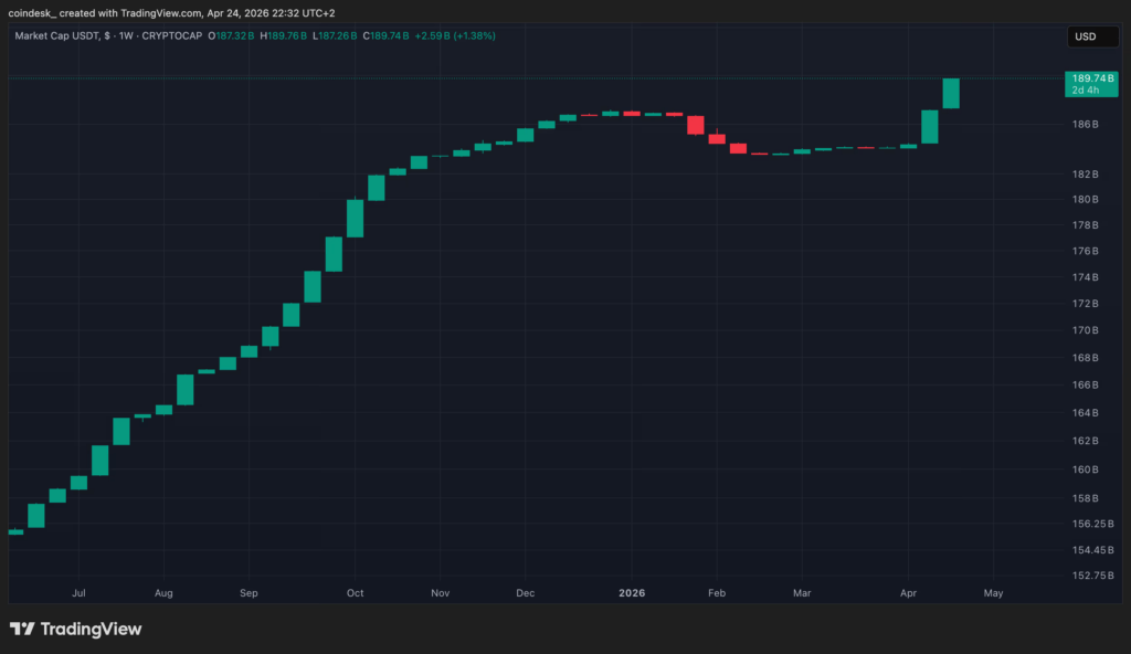 Um dos grandes motores dessa virada é a injeção bilionária de liquidez via USDT. A oferta da stablecoin da Tether saltou US$ 5 bilhões em apenas duas semanas, atingindo a marca de quase US$ 150 bilhões totais após meses de estagnação.